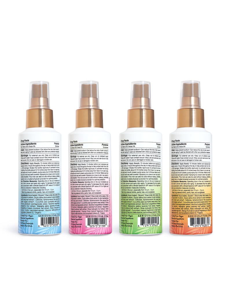 Includes all FOUR of our award-winning, elegant and convenient SPF facial mists each in a 3 fl oz size ~ Unscented + Tropical Floral + Fresh Greens + Exotic Fruit.